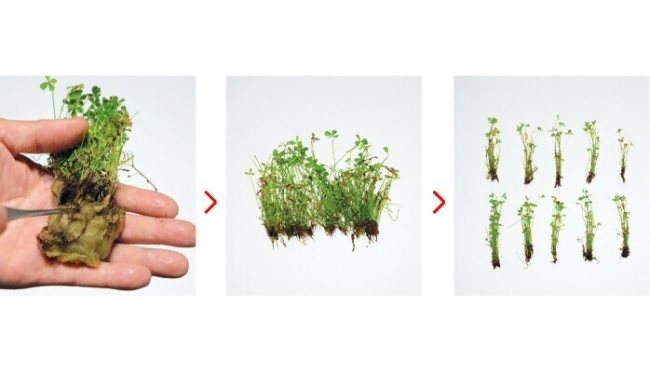 - Почвопокровники. Имеют очень мелкие корни, их сложно сажать рукам или обрезать. Такие разновидности продают в горшочках с минеральным наполнителем — ватой. Вату удаляют или обрезают так, чтобы было не больше 1 см ваты. Растения делят на кучки или порции. Их высаживают на расстоянии 2–4 см друг от друга, захватывая каждую кучку пинцетом.