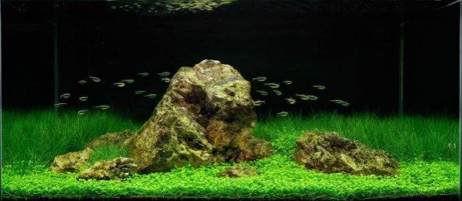 Оформление резервуара с растениями строится по панорамному принципу, позволяющему охватывать зрением большую часть подводного ландшафта.