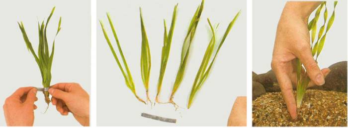 Такие растения хорошо утапливают в грунте, ориентируясь на зеленую часть. Ее оставляют над поверхностью. Растение хорошо присыпают почвой, чтобы оно не всплыло, сверху кладут грузик (камень, гальку, легкий предмет декора). Когда оно закрепится в почве, грузик убирают.
