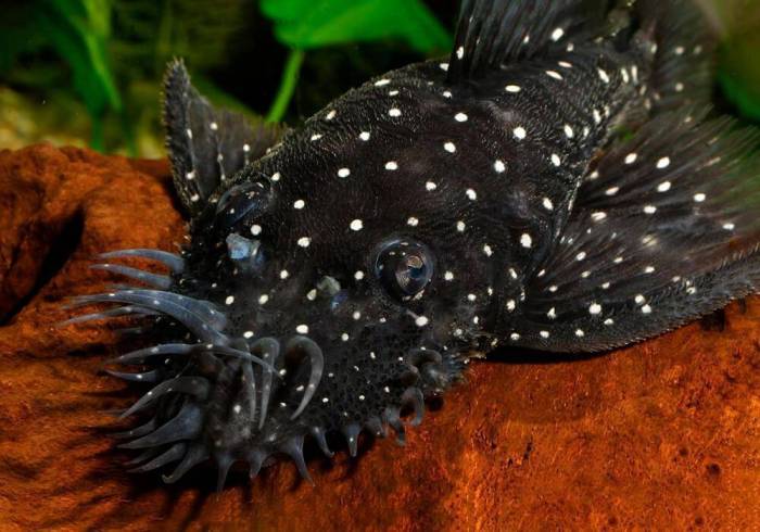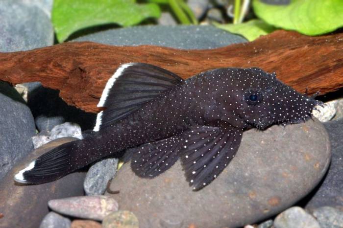 Эти анциструсы самые красивые: их черного цвета тело покрыто равномерными голубоватыми точками. Спинки и хвостовые плавники молодых рыб украшены белой каймой.