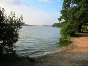 Панорама пляжа на озере Бисерово: