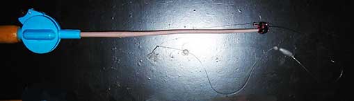В случае наличия течения используется первый из рассмотренных вариантов – удочка с кивком или сторожком. Её можно без проблем сделать своими руками. Обычно подобные удочки весьма напоминают зимние для ловли при помощи блесен или мормышек. В некоторых случаях применяются короткие удилища длиной обычно до 1 м либо же применяются несколько модифицированные зимние удилища, дополнительная оснастка которых выполняется следующим образом: отрезаются кончик хлыстика и тюльпан, а на кончик надевается кивок. Либо можно докупить хлыстик особенной формы. При этом нужно учесть, что передняя часть удочки при её установке на борту не должна перевешивать рукоять.