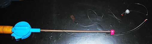 Телескопическое удилище длиной в 3-5 метров с кольцами оснащается безинерционной или проводочной катушкой легкого хода. На нее наматывается рабочая леска, чаще всего это монофил толщиной в 0,18-0,20 миллиметров.