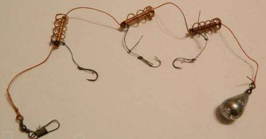 Стандартная донная оснастка, чтобы сделать донную удочку с поплавком – пружина продевается на леску, затем снизу — стопор или бусина. На конце лески привязываем вертлюжок либо заводное колечко. Стопор или бусина нужны, чтобы кормушка не била по узлу. Кольцо или вертлюжок привязываем любым рыболовным узлом – обычной рыбацкой петлей, клинчем, паломаром. А вот к колечку или вертлюгу можем ставить поводок. Или два поводка. Но для оснастки удочки с кормушкой двумя крючками нужно позаботиться, чтобы они не путались. То есть, поставить коромысло или связать подольскую вилку (об этом далее).