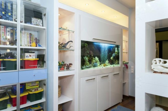 Если планируется установка в этой комнате, нужно взвесить все плюсы и минусы. С одной стороны, ребенку будет интересно наблюдать за рыбками и познавать окружающий мир. С другой – дети неосторожны, поэтому могут случайно повредить или уронить емкость (если она небольшая). Рекомендуется устанавливать аквариум в спальню, когда ребенок немного повзрослеет. Объекты обычно оборудуют безопасными системами жизнеобеспечения, а также встраивают в нишу или в стену, чтобы защитить от падения.