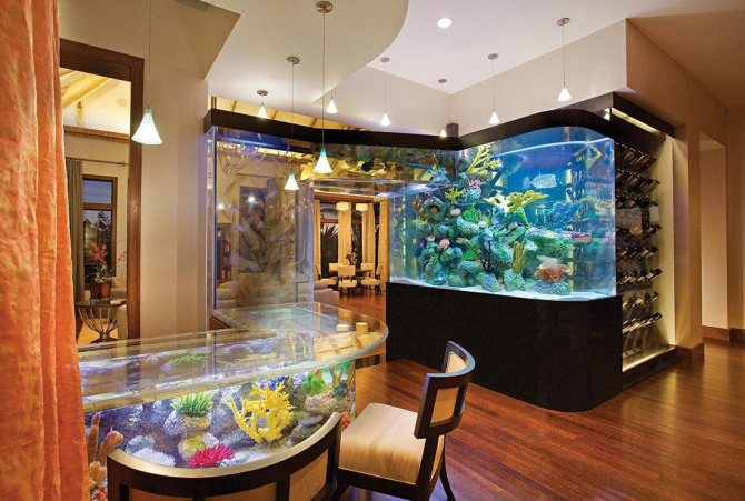 Обратите внимание! В небольших гостиных аквариум может играть роль перегородки. В этом случае обычно выбирают узкие, но высокие варианты
