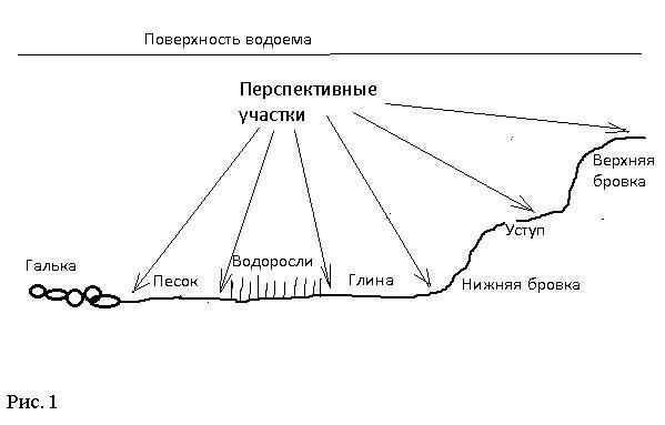Замечено, что донная рыба предпочитает те участки дна, где имеются какие-то выраженные неоднородности. Это ямы, перепады глубин, уступы на склонах, границы галечного дна с осадочным дном, осадочного дна с водорослями, открытые участки дна среди водорослей и т.д. Одним словом, все, что как-то контрастирует с окружающим. Наша задача найти эти участки (рис. 1).