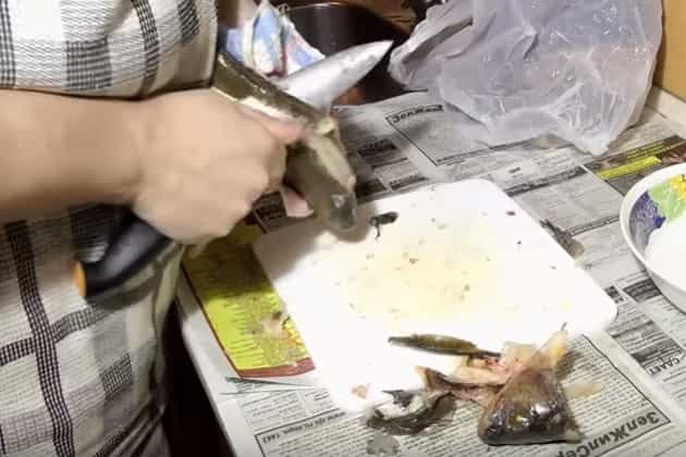 Для очистки некоторые домохозяйки используют специальный кухонный нож, но кто-то использует и самый простой, который окажется под рукой. После того, как чешуя будет пропарена кипятком, она очень легко снимется, не разлетится по всей кухне. После того, как кожа будет снята – необходимо будет выполнить дальнейшие действия, а именно вспороть ей брюхо.