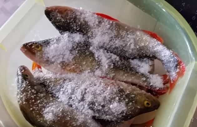 - Затем обвалять хорошенько в соли. Да так, чтобы полностью соль закрывала всю рыбёху.