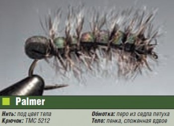 Пеночные эксперименты я продолжил и со своей любимой мушкой Palmer. Не знаю, кому принадлежит авторство этой мушки с телом из пенки, но первоначальный ее вариант я увидел в одном из каталогов, а со своей стороны внес как дополнение двойное тело и двойную обмотку петушиным пером.