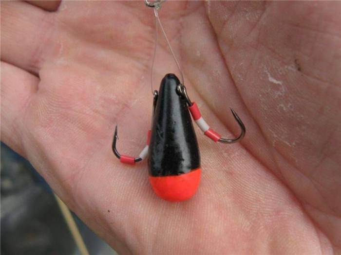 Вес грузила зависит от глубины и течения. Как правило, хватает изделия с массой 5-7 г. Грузила бывают разной формы: вытянутые с плоским основанием или овальные. Независимо от конфигурации свинца, в верхней части находится отверстие, в которое продето колечко из плотного нейлона, диаметром 0,2-0,25 мм. Отрезок колечка составляет не более 5-7 см, по нему двигаются крючки с обманками.