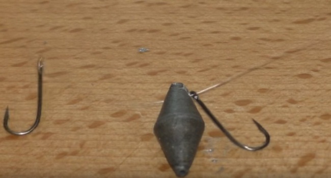 На отрезок лески одеваем сначала один крючок, следом грузило, а затем и второй крючок. Жало должны смотреть в разные стороны.