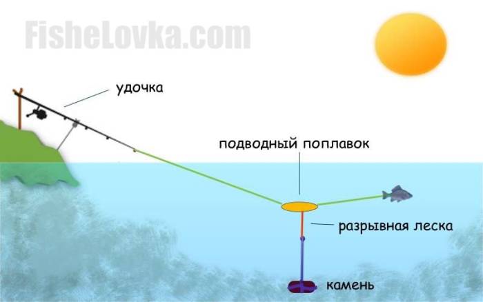 Донка с подводным поплавком для ловли сома с приминением камня и разрывной лески.