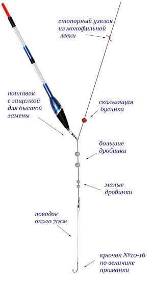 Особенность такой снасти – два поплавка, большой и малый. Большой (и грузила к нему) используются только для утяжеления оснастки – чтобы быстро доставлять приманку на дно. Как сигнализатор выше на леске добавляется маленький поплавочек. Соответственно, снасть догружается затем дополнительно, чтобы потопить и его, подпаском и, если нужно, дополнительным грузилом. В готовой снасти большой поплавок при поклевке тянет вверх всю оснастку – ведь рыба подняла подпасок.
