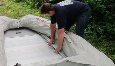 - Лодку сдувают, укладывают на ровную поверхность и тщательно разравнивают место с проколом.