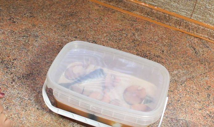 - Укладываем в емкость лук, рыбу заливаем все это маринадом и, закрыв крышку тары, ставим ее в прохладное место.