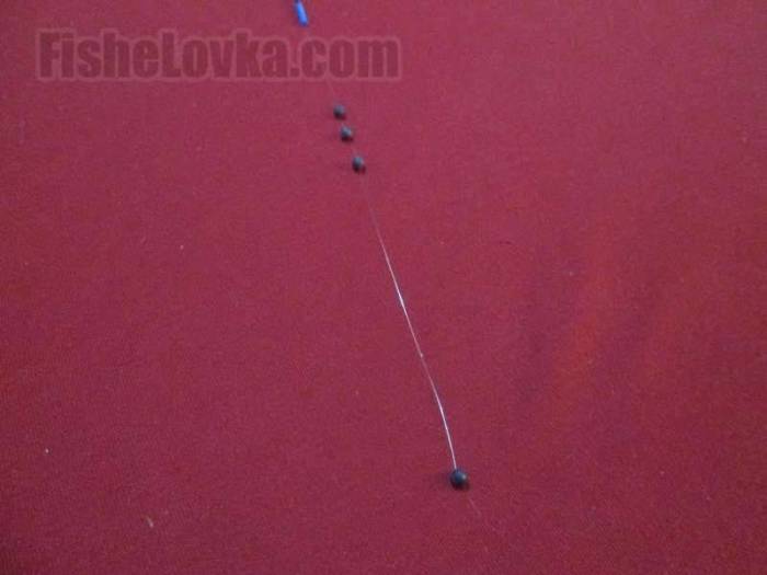 - В качестве ограничительного элемента (стопора) для грузика используется бусина, которую надевают на леску. Потом сквозь неё проводят свободный край лесы (оборачивая бусинку нитью вокруг несколько раз). Далее на оставшийся край лески привязывают поводок и крючок.