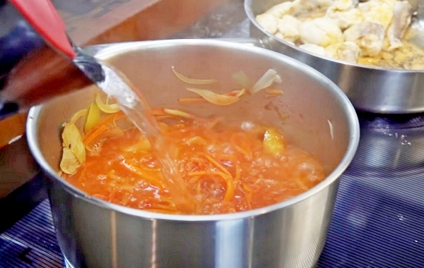 - Нам нужно получить насыщенный, кисловатый вкус маринада, который при остывании потеряет часть кислоты. Залить им рыбу, дать остыть и отправить в холодильник.