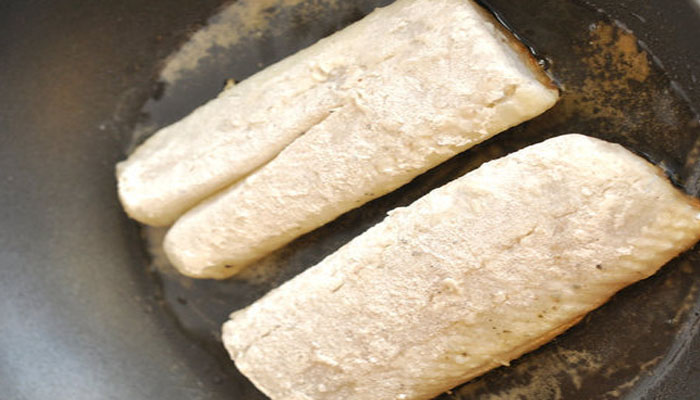 - Рыбу положить на сито, дать стечь жидкости, запанировать в муке и обжарить с двух сторон.