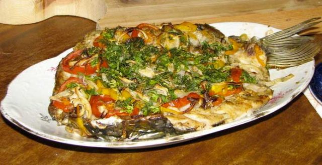 Сазан, запеченный с овощами, выглядит эффектно и празднично. Однозначно, такое блюдо будет украшением стола. Рыба получается сочной, а овощи и зелень придадут неповторимый аромат.