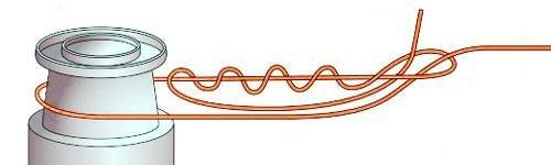 Узел является самозатягивающимся, чем больше нагрузка на леску, тем сильнее он затягивается на шпуле.