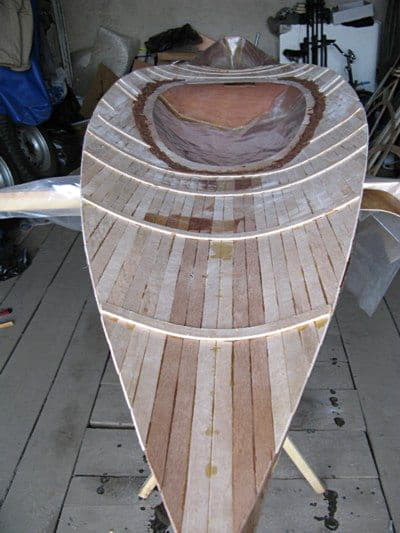 - Еще раз выполняют подгонку нижней части лодки и деки, между ними не должно быть зазоров. После этого приступают к склеиванию всех элементов, места стыков покрывают эпоксидной смолой.