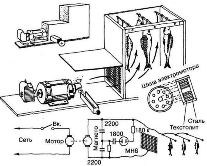 Самой распространённой конструкцией является коптильная установка с дымогенератором и компрессором: