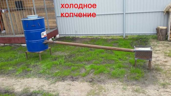 Основой для самодельной коптилки такого типа чаще всего служит старая металлическая бочка. Ее конструкция идеально подходит для холодного копчения. Но при желании камеру можно выполнить практически из любого материала, подходящего по конструкции. Это связано с небольшой температурой внутри устройства, которая не требует организации пожароустойчивых элементов.