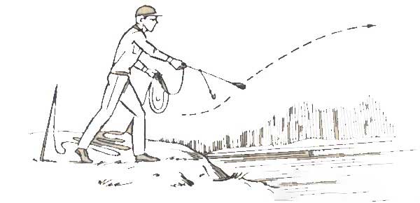 Чтобы доставить наживку к «тому берегу» стали использовать приспособление, выполненное в виде древка, ровной прочной ветки, обрезанной трубки от лыжной палки длиной 0,8-1,2 м, снабженной на конце пологим боковым отводом 3-5 см в виде сучка. Шнур с грузила крепится на этом отводе с возможностью соскальзывания. Пользуясь этим приспособлением как удилищем, снасть можно забросить на дистанцию 100 м.