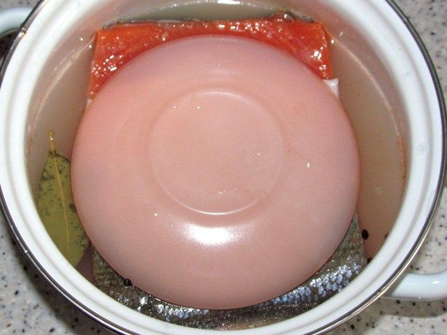 - Накройте рыбу марлей, положите на нее тарелку. Сверху поставьте банку, наполненную водой.