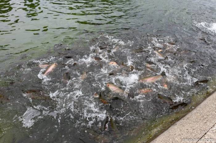 Форель нужно часто кормить. В противном случае, голодные рыбы могут начать пожирать своих сородичей. Когда экскурсовод кидает им корм, вода начинает буквально кипеть, рыбы выпрыгивают из воды, отталкивают друг друга в надежде заполучить побольше еды.