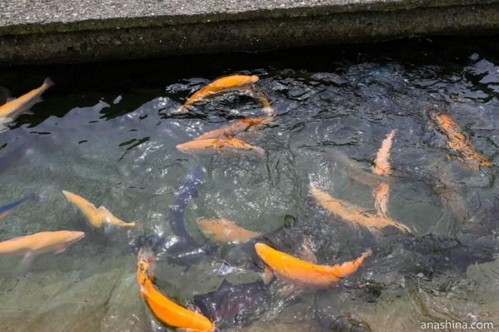 Интересно наблюдать за кормлением рыбы. Некоторые сразу бросаются к еде, выпрыгивают из воды, чтобы схватить побольше. Другие же держатся чуть в стороне.