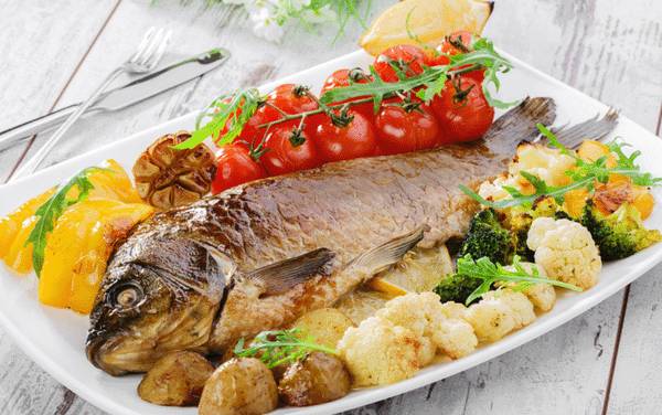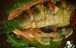 По истечению времени карп достается из духовки, сервируется вместе с овощами и подается к столу. Приятного аппетита.