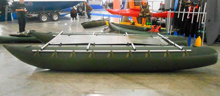 Такие поливинилхлоридные плавательные средства у рыбаков пользуются особой популярностью. Причем они предполагают наличие четырех пассажирских мест. Здесь отсутствует гик. Латки делают резиновые. Растяжка находится прямо на поверхности баллонов.