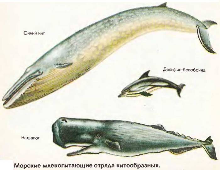 Рисунок: Морские млекопитающие отряда китообразные — синий кит, кашалот, дельфин-белобочка