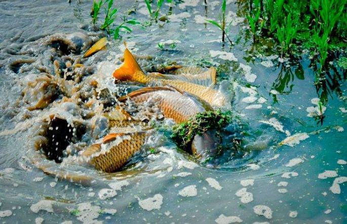 Процесс нереста карпа в пруду несколько отличается от процесса нереста в реках. Дело в том, что пруды мало когда разливаются и карп подходит близко к берегу, чтобы отложить икру. Как правило, самки выбирают труднодоступные участки с зарослями водной растительности или другими преградами, в виде нагромождения корней или завалов деревьев. Карп пытается защитить икру от посягательств хищной рыбы, отложив ее в практически недоступные места. Поскольку вода в прудах прогревается быстрее, то период нереста может начаться раньше, уже при температуре воды +15 градусов, хотя, в основном, икрометание происходит при температуре не ниже +18 градусов.