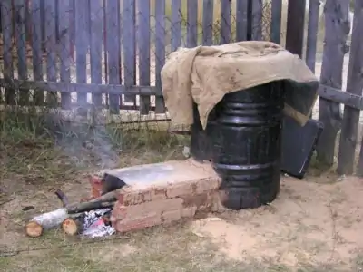 - Собирают коптильню: устанавливают внутрь поддон и решетки, баки ставят на кирпичные стенки. Накрывают крышкой или мешковиной.