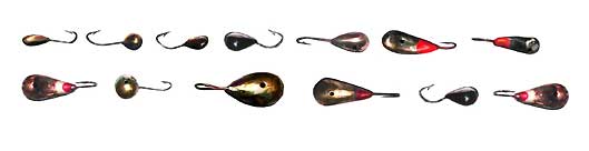 На снимке показан комплект самодельных мормышек с коронками, подобранных для ловли рыбы на разной глубине и течении. Материалом для изготовления коронок послужили тонкокатаные металлы.