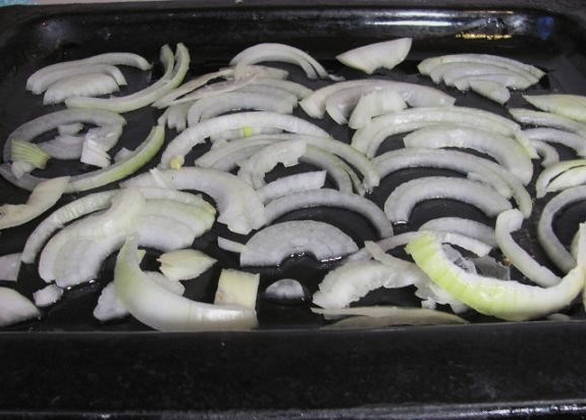 Шаг 2. Противень смазываем небольшим количеством растительного масла и тонким слоем выкладываем полукольца репчатого лука.