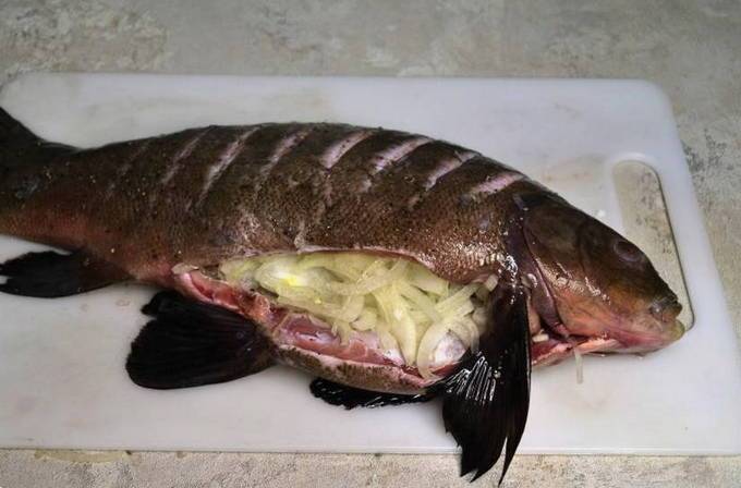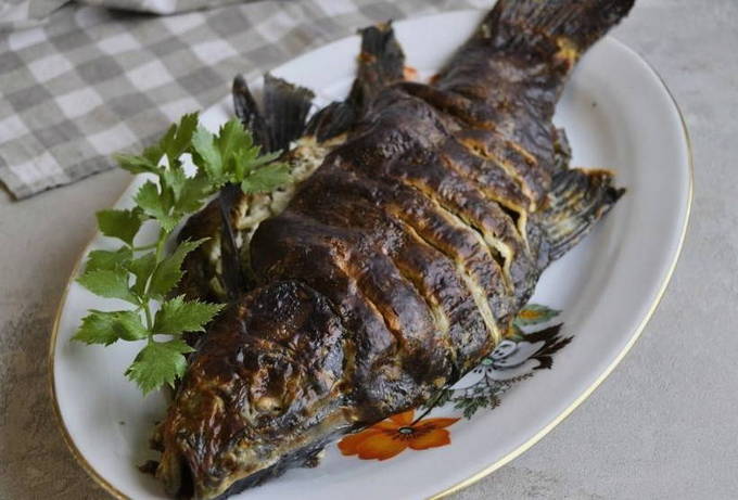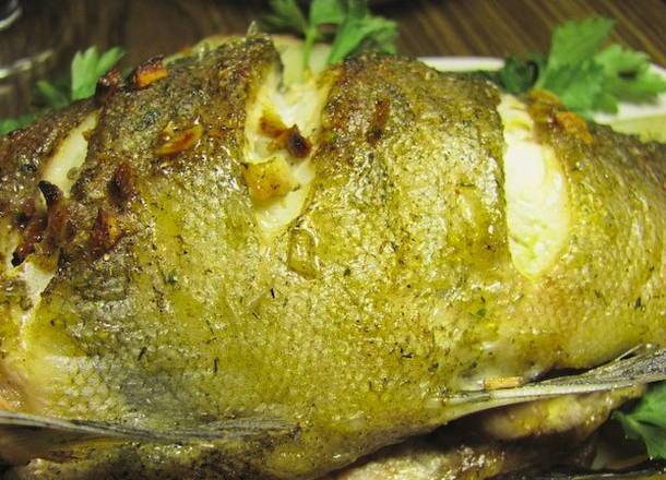 - обмазав тушку рыбы маслом, запечь ее при высокой температуре на противне, при этом время от времени поливая ее соусом или жиром;