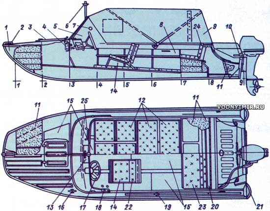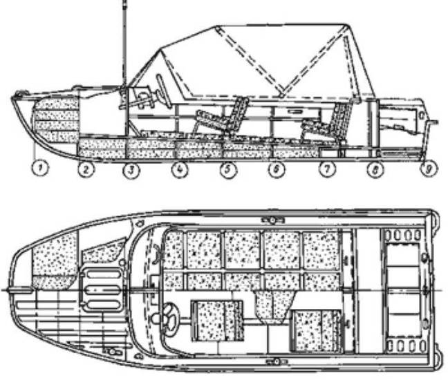 Подробный чертеж устройства глиссера Казанка в разрезе поможет увидеть развертку конструкции, расположение герметичных отсеков, ребер жесткости.