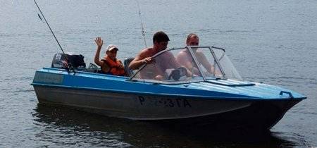 Сверху по бортам встроены гнезда для установки весел и специальных дуг, на которые натягивается тент. С внутренней стороны бортов сделаны ниши для сохранения различных небольших вещей и дополнительных лодочных принадлежностей. Хорошо продумана форма и высота ветрового стекла из стеклопластика. Стекло имеет выгнутую форму, благодаря которой оно защищает находящихся в лодке людей от брызг и встречного воздушного потока.