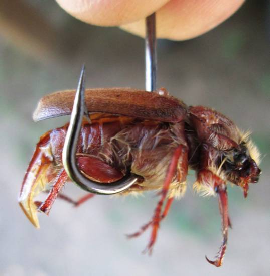 Мелких жуков насаживают по два, чуть выпуская жало крючка из брюшка — это позволит качественно подсечь рыбу при поклевке на дальней дистанции. Майских жуков крупного размера насаживают по одному, отрывая им твердые надкрылья.