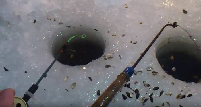 Для удачного исхода рыбалки стоит взять с собой оба вида оснасток, с различным количеством крючков и мормышек, настроенных на разные глубины. Пробурить несколько лунок, а прикормку бросить примерно на середину, чтобы она работала на все сразу. В них установить удочки и проверить на какой будут лучше идти поклевки, такой способ заметно сократит время на подбор правильной оснастки. Донные снасти.