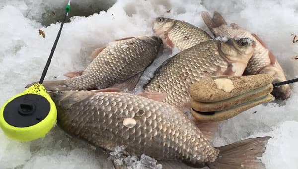 Карась в холодное время года предпочитает участки водоема, глубина которых достигает 5-7 м. Для ловли рыбы на пруду и водохранилище, стоит использовать кивковые мормышечные и поплавочные зимние удочки.