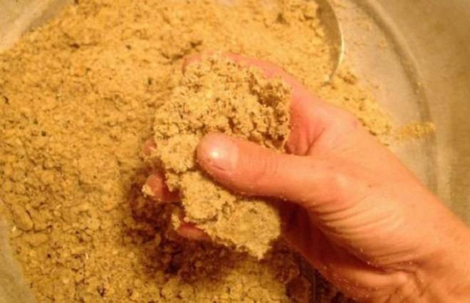 Прикормка из гороха на леща для фидерной ловли в готовом виде должна хорошо лепится, но разваливаться при надавливании. Это обусловлено особой тактикой фидера – частыми перезабросами и постоянным закармливанием одной точки. Поэтому гороховое пюре или кашу разбиваем рыхлой мелкой составляющей – панировочными сухарями, молотым жмыхом или магазинными смесями. В результате получаем достаточно рыхлую смесь, которая лепится при сжатии для набивания кормушки.