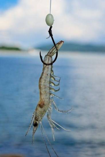 Для обеспечения более дальнего заброса, следует нанизывать креветку под её подбородком, так чтобы острие крючка пролезло через центральную часть головы (панциря) между важными органами. Недостаток – при таком способе насаживания, креветки быстро гибнут.