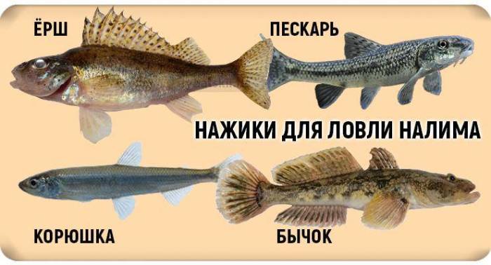 Летние насадки не нужно использовать зимой, результата не будет. Одним из главных условий выбора наживки — её свежесть, так как ни один из налимов не прельстится подпорченной, имеющей недостаточно хороший запах. В качестве наживки используют небольших рыбок: