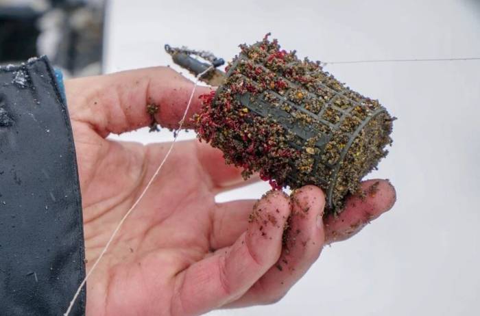 Важно лишь оснащать кормушку в виде скользящей оснастки, чтобы она свободно перемещалась на определенной длине, так как налим во время кормежки будет ее толкать, что не позволит нормально видеть поклевку. Кормушку набивают ароматным кормом животного происхождения