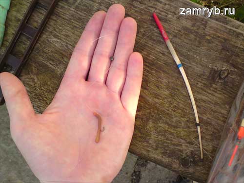Жало крючка открыто, червь закрывает полностью цевьё крючка, а часть червя натянута на леску. По-моему, червь, наживленный на крючок таким образом, наиболее привлекателен для плотвы при ловле на течении.
